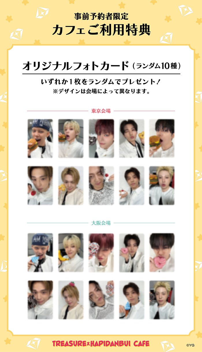 TREASURE×HAPIDANBUI CAFE店舗にてグッズを8,000円(税込)お買い上げごとに「フォトカード(ランダム10種)」をいずれか1枚プレゼント!